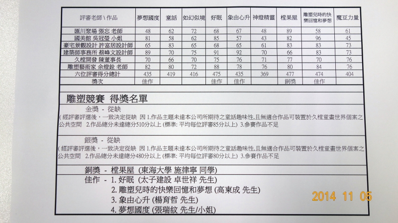 我們已於10月28日下午邀請 匯川聚場藝術總監 張忘老師 / 雕塑藝術家 余燈銓老師 / 國美館 吳冠瑩小姐 / 豪宅景觀設計 許太太設計博士 / 建築師事務所 蔡峰文設計師 及 本公司集團 陳董事長擔任評審,並於當日評選完畢。此次的雕塑競賽因參賽作品不足,以及作品主題未達本公司所期待之童話趣味性,且無適合作品可裝置於久樘童畫世界個案之公共空間,經評審評選後,公司最後決定金獎,銀獎從缺。